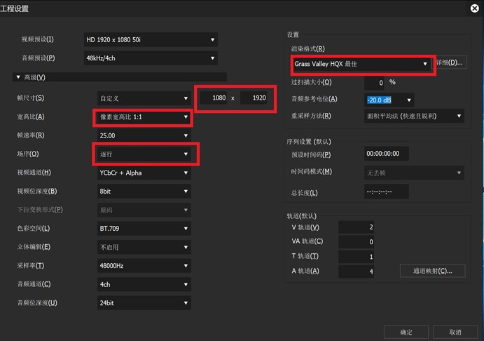 在自定义内分别设置帧尺寸为1080×1920、像素宽高比为1:1,场序为逐行,渲染格式为Grass Valley HQX 最佳。